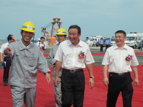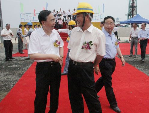 廣東省委常委、常務(wù)副省長朱小丹在湛江市委書記、市人大常委會主任劉小華,四航局董事長、黨委書記梁卓仁等人陪同下,來到北護(hù)岸觀禮臺,察看了30萬噸大型散貨碼頭的沉樁施工,梁卓仁向朱小丹介紹了30萬噸大型散貨碼頭的施工組織與計(jì)劃。