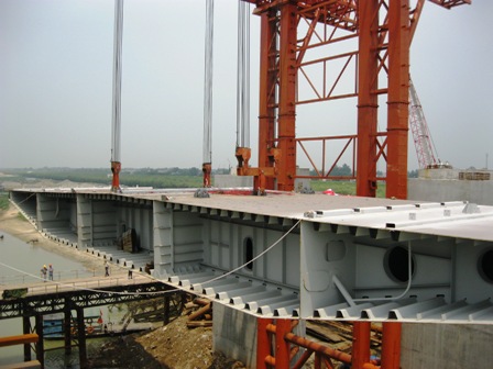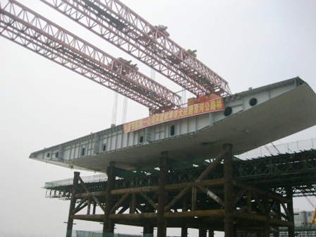 蚌埠淮河公路橋主橋首節(jié)鋼箱梁吊裝成功