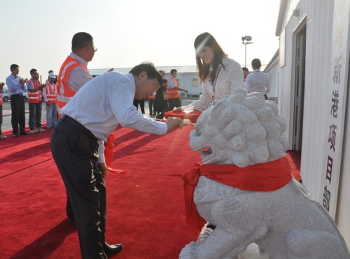 10月10日,中交股份董事長周紀昌在中港總經(jīng)理孫子宇、四航局總經(jīng)理孫國強、副總經(jīng)理李惠明等陪同下,到多哈新港項目檢查指導(dǎo)工作并參加開工奠基儀式。