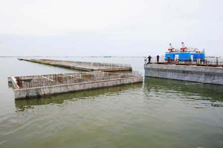 洛比托擴(kuò)建項目礦石碼頭共預(yù)制沉箱19件,單件長18.7米、寬14.3米、高17.3米,約重2200噸,是迄今為止安哥拉境內(nèi)規(guī)模最大的沉箱。綜合考慮成本、工期、人力資源等因素,項目部沒有引進(jìn)專業(yè)分包隊伍施工,自行組織由技術(shù)員、施工班長帶頭、當(dāng)?shù)貏诠橹髁姷氖┕ぐ嘟M施工,把整個施工工藝流程逐個分解量化,并認(rèn)真落實,確保了整個施工計劃如期完成。該項目19件沉箱安裝面平線順,相鄰沉箱高差不超過5厘米,縫隙不超過5厘米,得到了南華監(jiān)理、中港和外國咨工的一致贊賞。