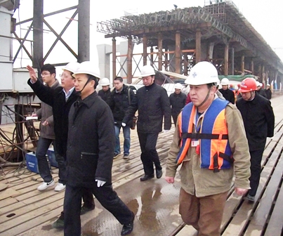 陳啟濤一行親切看望和慰問了春節(jié)期間堅守在工地的項目部工程建設(shè)人員。在南岸17號墩鋼箱梁施工現(xiàn)場,陳書記認(rèn)真聽取了項目部關(guān)于施工進(jìn)度、安全、質(zhì)量等情況的匯報,詳細(xì)詢問了箱梁制作及頂推施工情況,高度肯定了項目部為蚌埠“三年大建設(shè)”所做出的積極貢獻(xiàn)。他強調(diào),今年是大橋施工的決戰(zhàn)年,希望項目部再接再厲,迎難而上,確保順利實現(xiàn)2013年元旦通車的目標(biāo)。