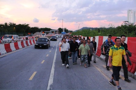 18時(shí)收到檳州政府關(guān)于第一波海嘯預(yù)計(jì)21時(shí)左右襲擊檳城的警報(bào),駐地距離海岸直線距離不足150米,周邊地勢(shì)平坦沒有牢固的遮擋建筑,全部參建人員近四百人,情況十分危急。項(xiàng)目部決定全體人員轉(zhuǎn)移到附近地勢(shì)較高的山上。1 9時(shí)10分人員集合完畢,近四百員工僅攜帶隨身貴重物品分為5個(gè)方隊(duì)向疏散地點(diǎn)出發(fā),由于途徑公路沿線,工作人員做好交通疏導(dǎo),各方隊(duì)通過對(duì)講機(jī)密切聯(lián)系,一路上秩序井然。20時(shí)左右,全體人員安全到達(dá)疏散地點(diǎn)。項(xiàng)目部積極和安全局保持聯(lián)系,了解新聞動(dòng)態(tài)和海嘯警報(bào)動(dòng)向,為全體人員發(fā)放食物和礦泉水,穩(wěn)定人員情緒。21時(shí)20分許,收到馬來(lái)西亞已解除海嘯警報(bào)的通知后,所有人員在項(xiàng)目部組織下,于21時(shí)50分許平安返回項(xiàng)目駐地。