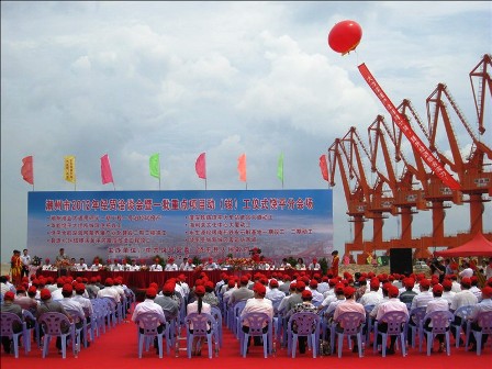 5月15日,潮州市隆重舉行2012經(jīng)貿(mào)洽談會(huì)暨一批重點(diǎn)項(xiàng)目動(dòng)(竣)工儀式。儀式為包括亞太碼頭一號(hào)泊位在內(nèi)的8個(gè)重點(diǎn)項(xiàng)目動(dòng)竣工推桿剪彩,掀起了推動(dòng)港口建設(shè)、發(fā)展臨港經(jīng)濟(jì)的新一輪項(xiàng)目建設(shè)高潮。潮州市市委副書記、市長(zhǎng)李慶雄等領(lǐng)導(dǎo),香港潮屬社團(tuán)總會(huì)會(huì)長(zhǎng)陳幼南,廣州港集團(tuán)公司總經(jīng)理助理蔡南樹,香港汕頭商會(huì)會(huì)長(zhǎng)黃成林,香港潮商互助社理事長(zhǎng)余潔儂等出席典禮。四航局潮州港亞太通用碼頭項(xiàng)目部部分員工作為參建單位代表參加儀式。
