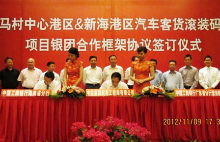 11月9日下午,四航局與工商銀行海南省分行及工商銀行廣東省分行營業(yè)部的“??诟垴R村中心港區(qū)及新海港區(qū)汽車客貨滾裝碼頭工程”項目銀團合作框架協議,海南中交四航建設有限公司與工商銀行??谛阌⒅?ldquo;新海港區(qū)2.2億、馬村港4.5億元”項目前期貸款合同簽約儀式在??谑信e行。