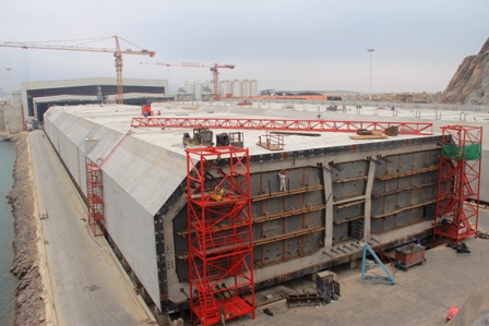 目前,兩管節(jié)正進行一次舾裝,封閉兩端后,將在管內(nèi)安裝水箱(相當(dāng)于將管節(jié)變成一個鋼筋混凝土結(jié)構(gòu)的巨型“潛水艇”),待管節(jié)經(jīng)水密性試驗后,在灌水的干塢內(nèi)浮運至寄放區(qū)二次舾裝,于日后浮運出塢沉放安裝。