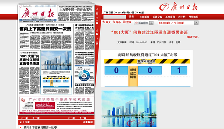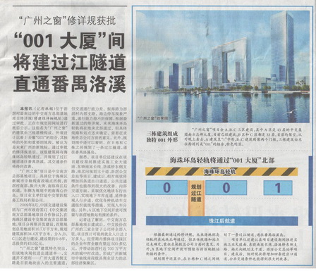 5月13日,《廣州日?qǐng)?bào)》A1版以《“廣州之窗”修詳規(guī)獲批——“001大廈”間將建過江隧道直通番禺洛溪》為題,詳細(xì)報(bào)道了四航局“廣州之窗”項(xiàng)目。