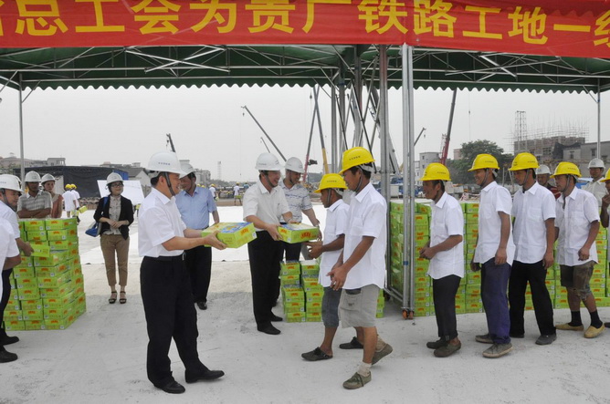 梁卓仁在會(huì)上作了講話,對(duì)黃業(yè)斌一行到工地慰問一線工人并送清涼表示衷心感謝,要求項(xiàng)目部把省總工會(huì)的慰問送到每一位參建員工手中,切實(shí)做細(xì)做實(shí)高溫季節(jié)的各項(xiàng)防暑降溫工作,不僅要關(guān)愛公司員工,還要關(guān)愛奮戰(zhàn)在一線的所有勞務(wù)派遣工和農(nóng)民工。梁卓仁強(qiáng)調(diào),貴廣鐵路關(guān)系到兩省一區(qū),建成后對(duì)促進(jìn)當(dāng)?shù)亟?jīng)濟(jì)發(fā)展有很大作用,要盡心盡責(zé)建設(shè)好該項(xiàng)目;雖然項(xiàng)目建設(shè)曾經(jīng)遭遇過一些波折,但目前已到最后沖刺階段,要充分發(fā)揚(yáng)四航局的優(yōu)良傳統(tǒng),既能打硬仗、更能打勝仗,在確保安全、質(zhì)量和環(huán)保的前提下,嚴(yán)格按照業(yè)主、政府的要求按期完成各項(xiàng)施工任務(wù)。