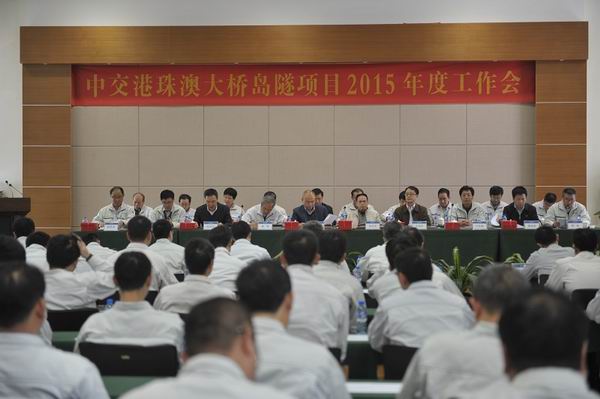 1月8日,中交港珠澳大橋島隧項目總部召開2015年度工作會。中國交建副總裁陳云、王海懷,港珠澳大橋管理局局長朱永靈,島隧項目總經(jīng)理林鳴、黨委書記劉先鵬,四航局副總經(jīng)理羅寬榮等出席。