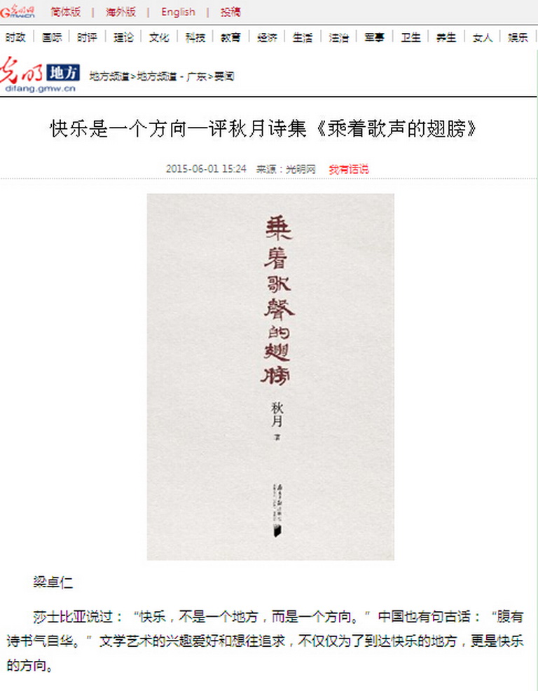 6月1日,光明網(wǎng)刊發(fā)全國勞動模范、四航局董事長、黨委書記梁卓仁的詩評文章《快樂是一個方向》,同時,四航局員工創(chuàng)作的個人詩集《乘著歌聲的翅膀》受到社會關(guān)注。