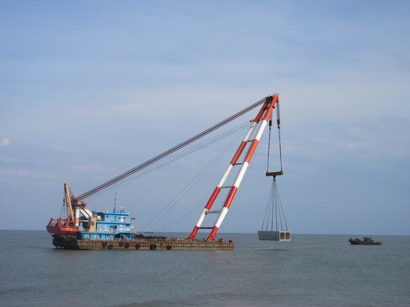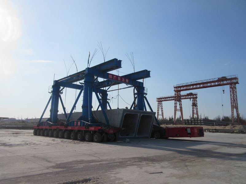 該項(xiàng)目共需出運(yùn)和安裝取排水箱涵136件,其中取水箱涵83件(單節(jié)最重約270噸),排水方涵53件(單節(jié)最重約282噸)。箱梁出運(yùn)、安裝于2015年3月1日正式啟動(dòng),最初采用氣囊出運(yùn)、起重船吊裝工藝。隨著安裝效率的提高,項(xiàng)目部采用效率更高的提梁車出運(yùn)工藝,克服了高溫及海況惡劣等影響,最終安全、優(yōu)質(zhì)完成所有出運(yùn)安裝工作。