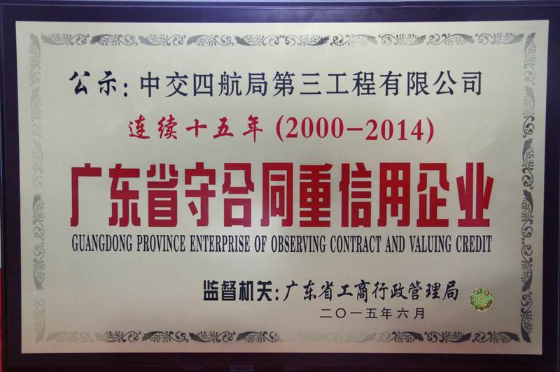日前,四航局三公司獲評(píng)2014年度“廣東省守合同重信用企業(yè)”稱(chēng)號(hào),這是三公司自2000年到2014年連續(xù)15年獲得該榮譽(yù)。