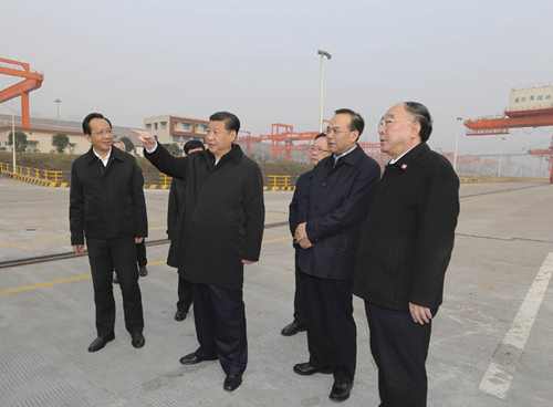 習(xí)近平聽取了長(zhǎng)江上游航運(yùn)中心建設(shè)、鐵路公路水路聯(lián)運(yùn)等情況介紹,察看了正在作業(yè)的集裝箱船,聽說(shuō)渝新歐(重慶—新疆阿拉山口—歐洲)國(guó)際鐵路沿線國(guó)家實(shí)現(xiàn)一次報(bào)關(guān)查驗(yàn)、全線放行,他贊賞“挺好”??吹礁劭谠O(shè)施齊備,已初具規(guī)模,他說(shuō):“這里大有希望”。