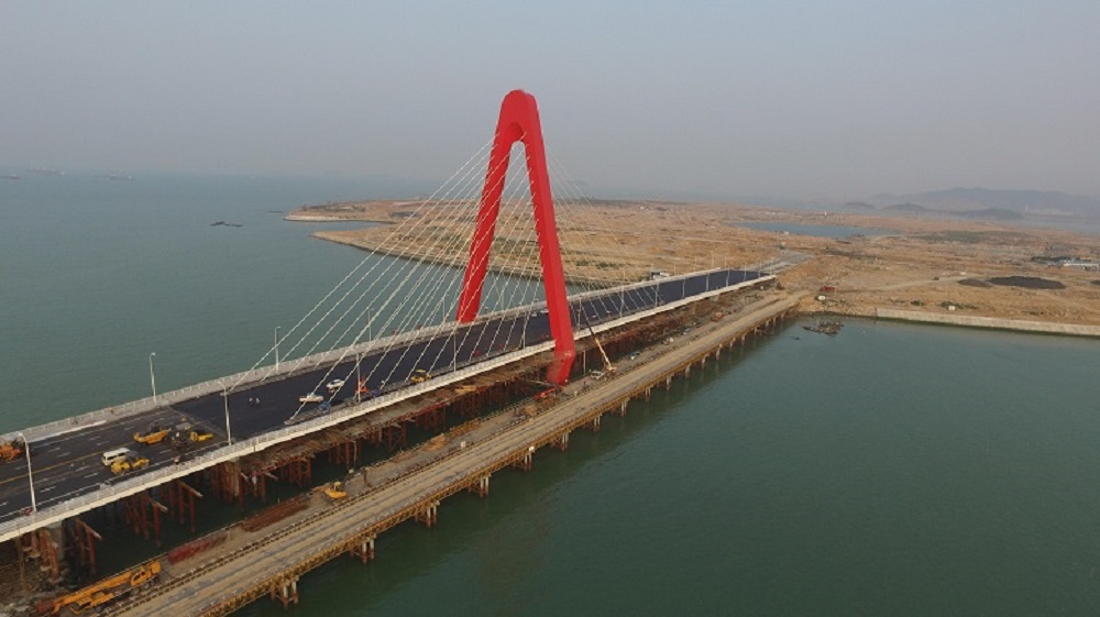 該工程是國內(nèi)首座大型離岸式生態(tài)人工島——雙魚島和島外陸地連接的主要通道。連接橋為海上斜拉橋,全長685.44米,主橋采用連續(xù)梁獨塔雙索面斜拉橋,主橋橋?qū)?9米,引橋橋?qū)?7米,索塔高度90米。工程歷時3年建設(shè)完成。