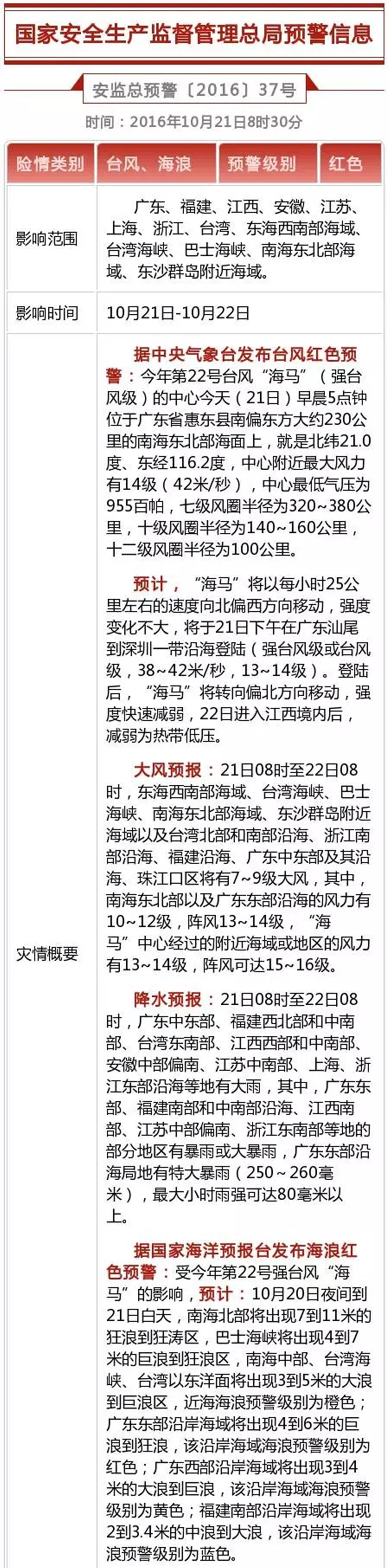 【紅色預(yù)警】"海馬"登陸廣東汕尾,國家安全生產(chǎn)監(jiān)督管理總局發(fā)布紅色預(yù)警,敬請(qǐng)做好防御!