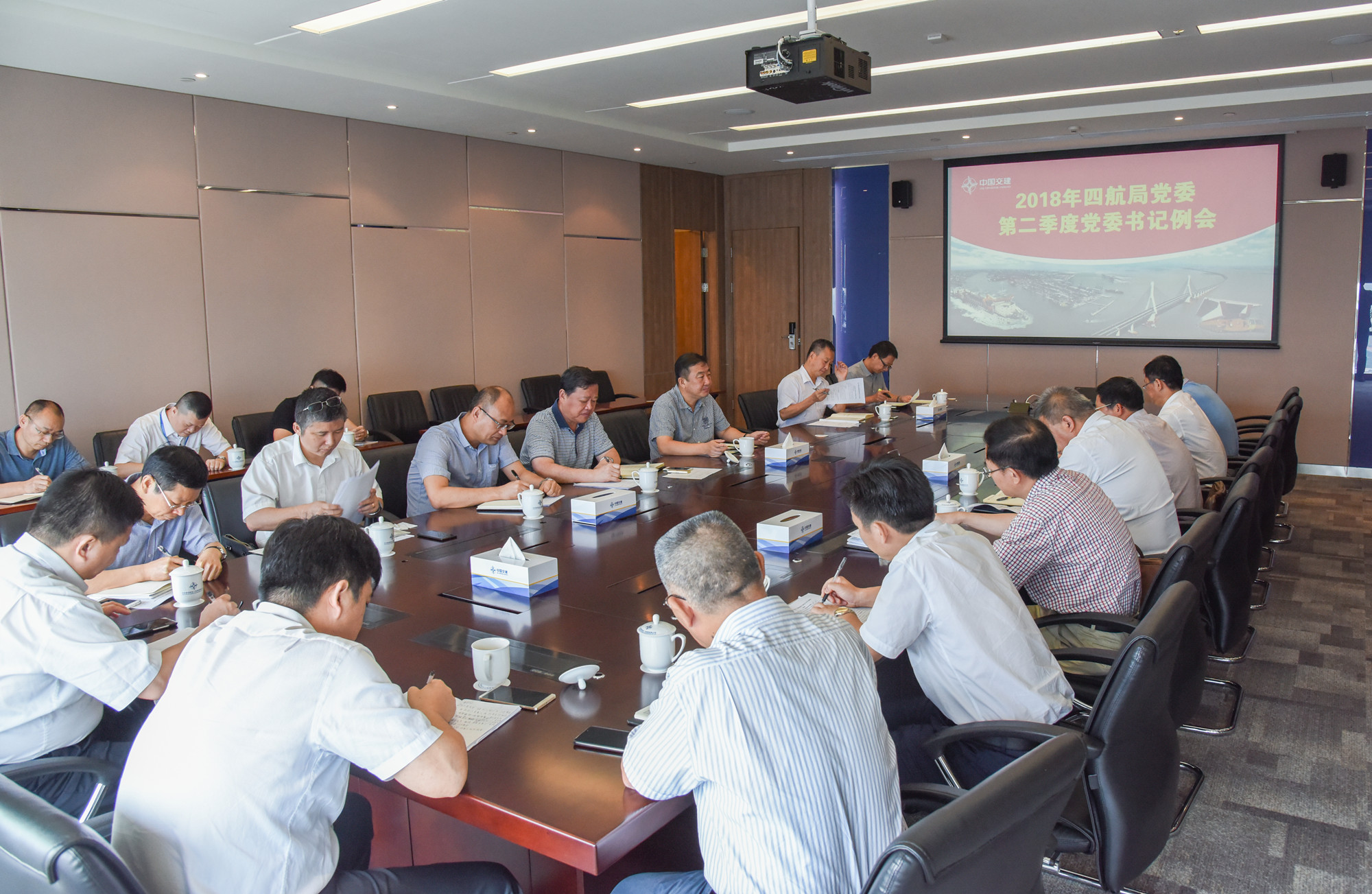 6月15日,四航局黨委書記、董事長梁卓仁主持召開2018年第二季度書記例會,四航局黨委副書記、紀委書記、工會主席張猛,黨群部門、各單位及項目公司黨組織負責人等23人參加會議。