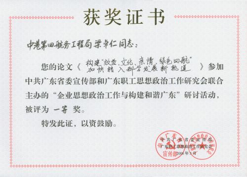在6月21日召開的廣東職工思想政治工作研究會第十二次年會暨"企業(yè)思想政治工作與構(gòu)建和諧廣東"研討會上,省委宣傳部副部長胡中梅等領(lǐng)導(dǎo)同志向全省90名論文獲獎?wù)叽眍C發(fā)了獲獎證書。我局局長、黨委書記梁卓仁同志撰寫的《構(gòu)建"效益、文化、親情、綠色四航",加快轉(zhuǎn)入科學(xué)發(fā)展新軌道》論文,榮獲一等獎。