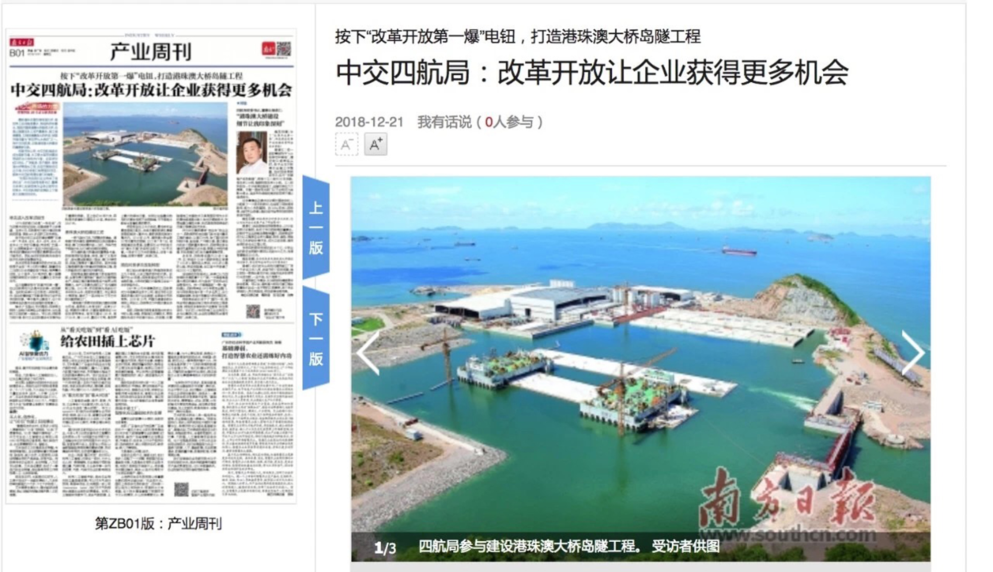 在活動召開前,南方日報社記者專程到四航局采訪梁卓仁董事長,撰寫了《中交四航局:改革開放讓企業(yè)獲得更多機(jī)會》??搶?姓宫F(xiàn)了四航局在改革開放中的成長歷程以及累累碩果。