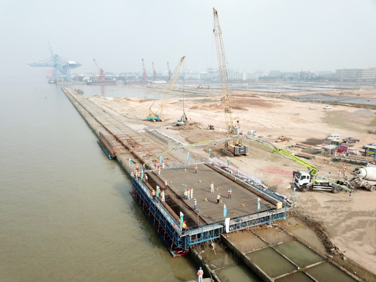 四航局廣州港新沙港區(qū)項(xiàng)目11號12號通用泊位完成首段胸墻澆筑