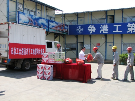 7月14日下午,防城港市總工會黨組書記、副主席吳世章一行到四航局防城港項目部慰問,并為四航建設(shè)者們送上了清涼飲料。