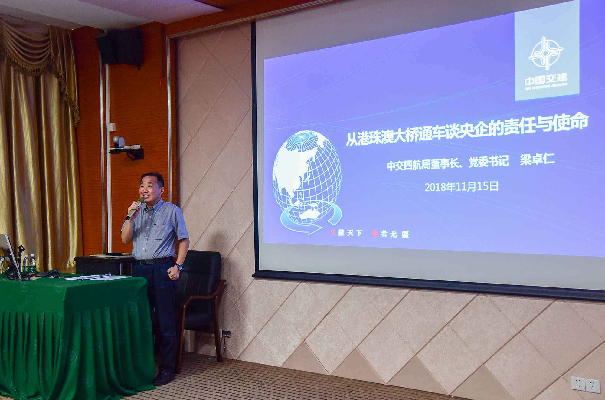專家講座上,梁卓仁以四航局參建的港珠澳大橋順利開通為序,講述了四航建設(shè)者參與港珠澳大橋建設(shè)的光輝歷程,生動詮釋了建設(shè)者們 “一塵不染”的工作理念和“每一節(jié)沉管都是第一節(jié)沉管”的工匠精神;通過講述“改革開放第一爆”、“四分錢驚動中南海”等歷史故事,展現(xiàn)了四航人“敢闖敢試、敢為人先”的改革創(chuàng)新精神;以斯里蘭卡科倫坡港、蒙內(nèi)鐵路以及巴基斯坦瓜達(dá)爾港等工程建設(shè)中的四航故事,闡述了央企踐行“一帶一路”倡議的責(zé)任和使命;以海南工程的感人事跡,彰顯出四航人“能打硬仗、打勝仗 ”的決心和擔(dān)當(dāng)。他強(qiáng)調(diào),中央企業(yè)是中國特色社會主義經(jīng)濟(jì)的“頂梁柱”,堅持黨的領(lǐng)導(dǎo)、加強(qiáng)黨的建設(shè),是國有企業(yè)的“根”和“魂”。